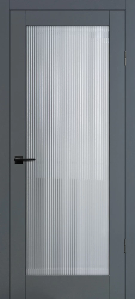 Царговое полотно, выполненное в гладком матовом покрытии, приятным на ощупь, обладающее высокими эксплуатационными характеристиками. Бескромочная технология. Полотно комплектуется объемной филенкой с фрезерованным рисунком "под рейку". В остекленных полотнах используется рифленное стекло с красивым прокатным узором в виде полос. Отлично смотрится в неоклассических и лофтовых интерьерах.